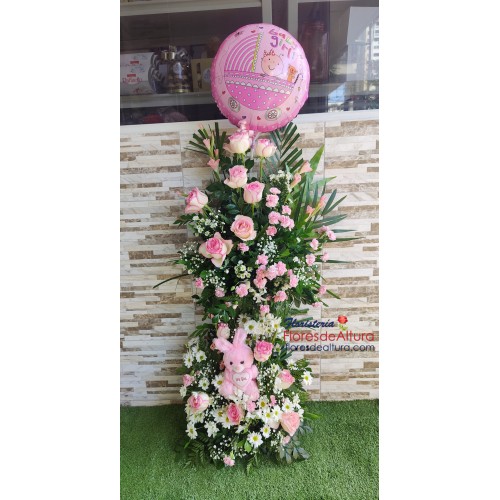 Todo lo agradable es lo que nuestro regalo representa para los nuevos padres que reciben a su bella recién nacida! Gladiolas, rosas rosadas y claveles, incluye globo de látex alusivo al nacimiento y un peluche rosado, exhibidos en un tronco natural, para los orgullosos mamá y papá. Los componentes pueden variar.